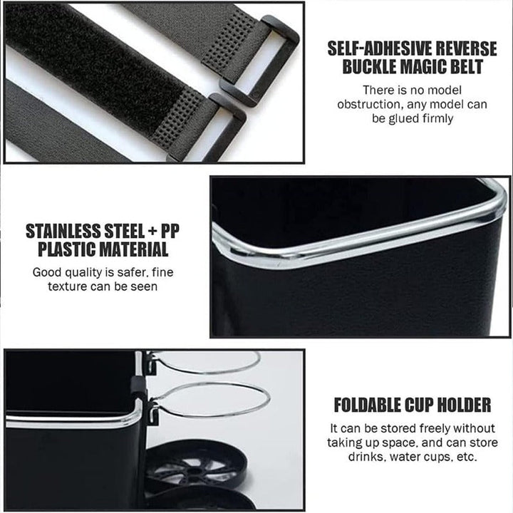 Velcro-strap arm-rest organizer combines a jumbo storage bin with twin fold-flat cup holders—no tools, no rattles, no spills.