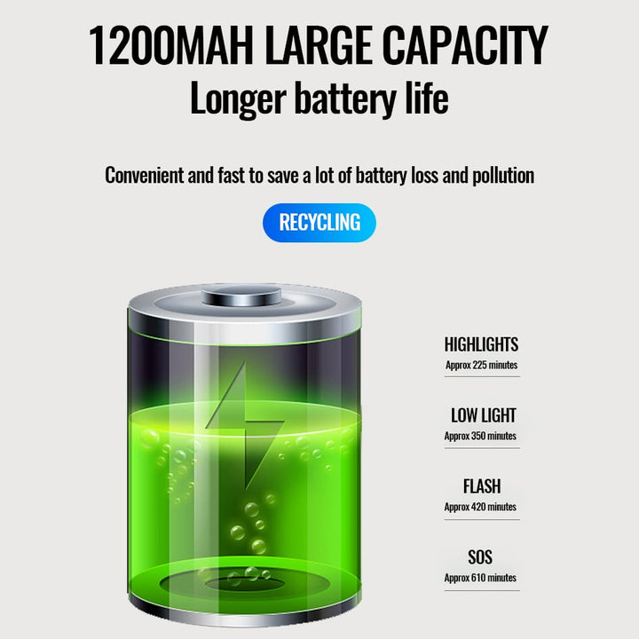 ăUSB RechargeableăWith Built-in 1200mAh lithium battery,used more convenience .With USB charging port, approx. 225 minutes In Strong Light Mode.