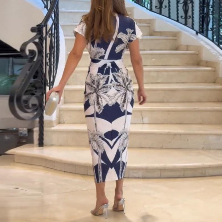 A dramatic plunging neckline, sculpted cap sleeves, and artful print combine to create an hourglass silhouette that transitions seamlessly from workday polish to evening glam.